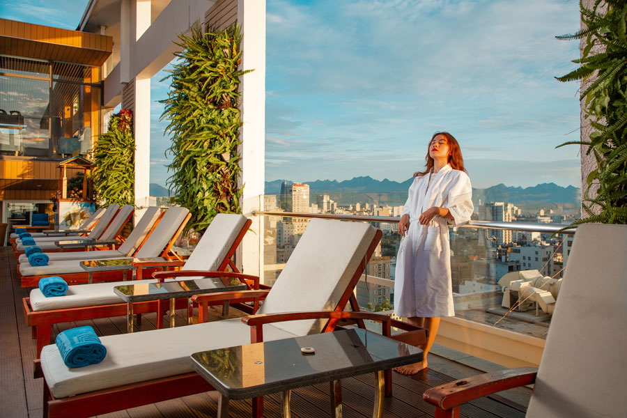 Hồ bơi ngoài trời trên tầng thượng của khách sạn hướng ra biển cũng sẽ mang đến cho bạn trải nghiệm tuyệt vời với cảm giác vừa ngâm mình trong bể bơi vừa thưởng thức những ly Cocktail ngon tuyệt.